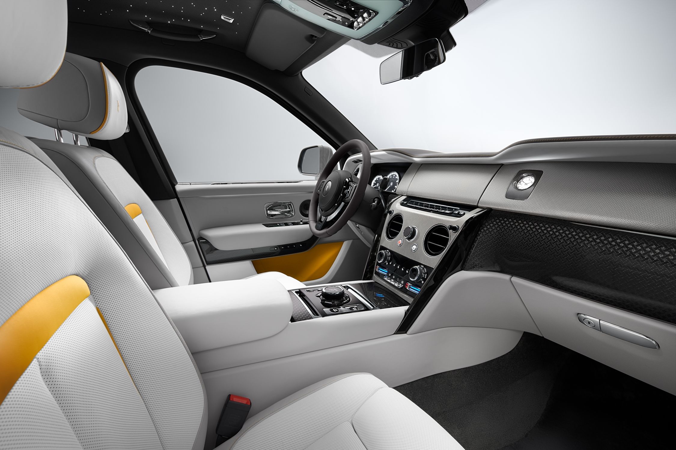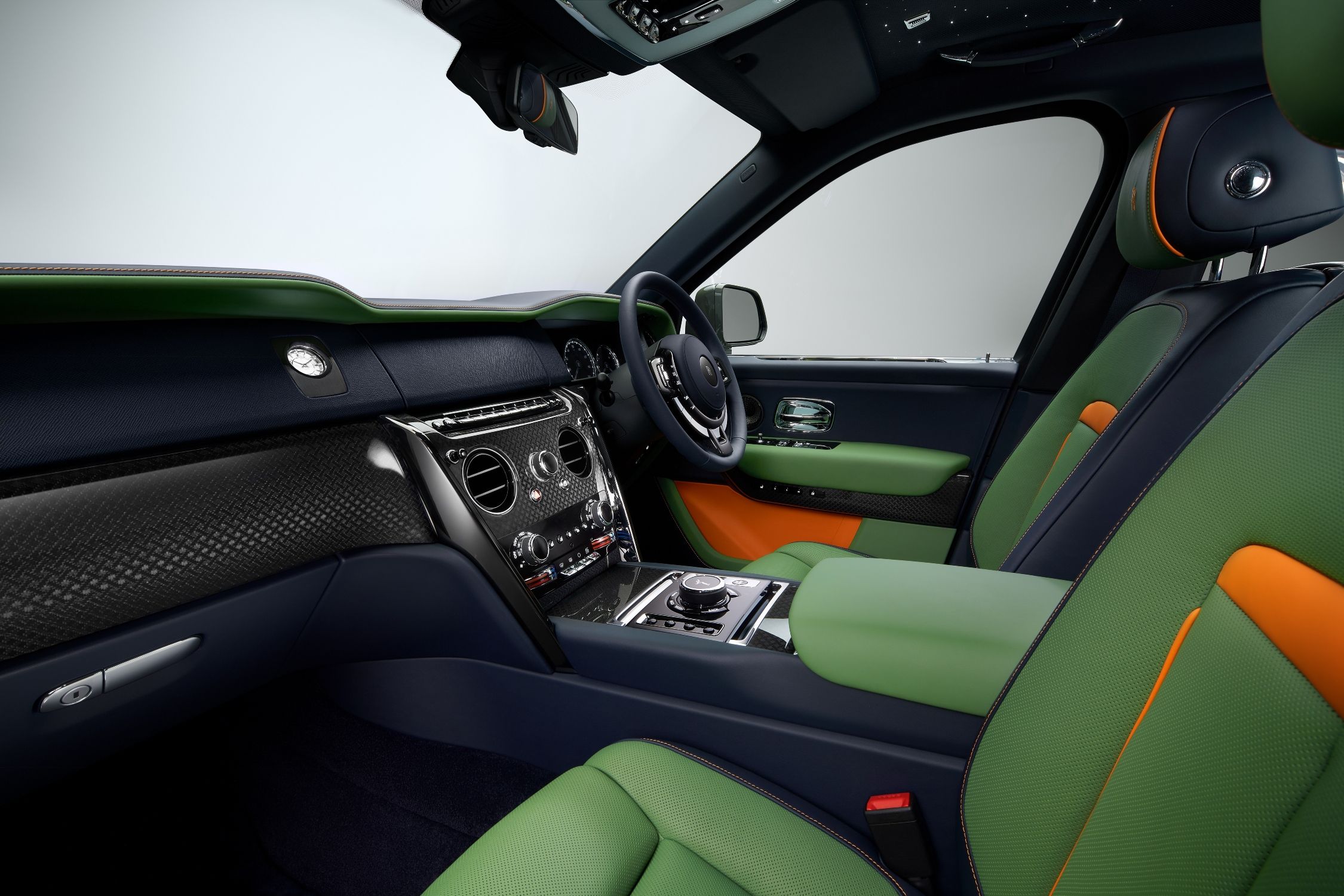 Cullinan – Inspired by Fashion Re-Belle je unikátním vozem, který odráží současné trendy v používání barev s živými odstíny a hravou kombinací textur. Barevný nádech interiéru s akcenty v růžové Peony nebo zelené Lime poskytuje neodolatelný kontrast s koženým čalouněním v odstínech bílá Arctic či šedá Cashmere. Palubní desku zdobí mimořádně jemná, ručně zpracovaná tkanina v barvě nerezové oceli, evokující oblečení s kovovým efektem, které lze letos vidět na přehlídkových molech. Jemné vlákno o průměru 0,45 mm vytváří spletitou texturu, která během jízdy působivě zachycuje světlo. Kolekce Re-Belle je nabízena v závislosti na zvoleném interiéru v barvách exteriéru zelená Lime, Gunmetal, Wildberry nebo bílá Arctic.